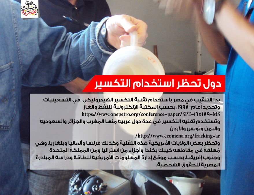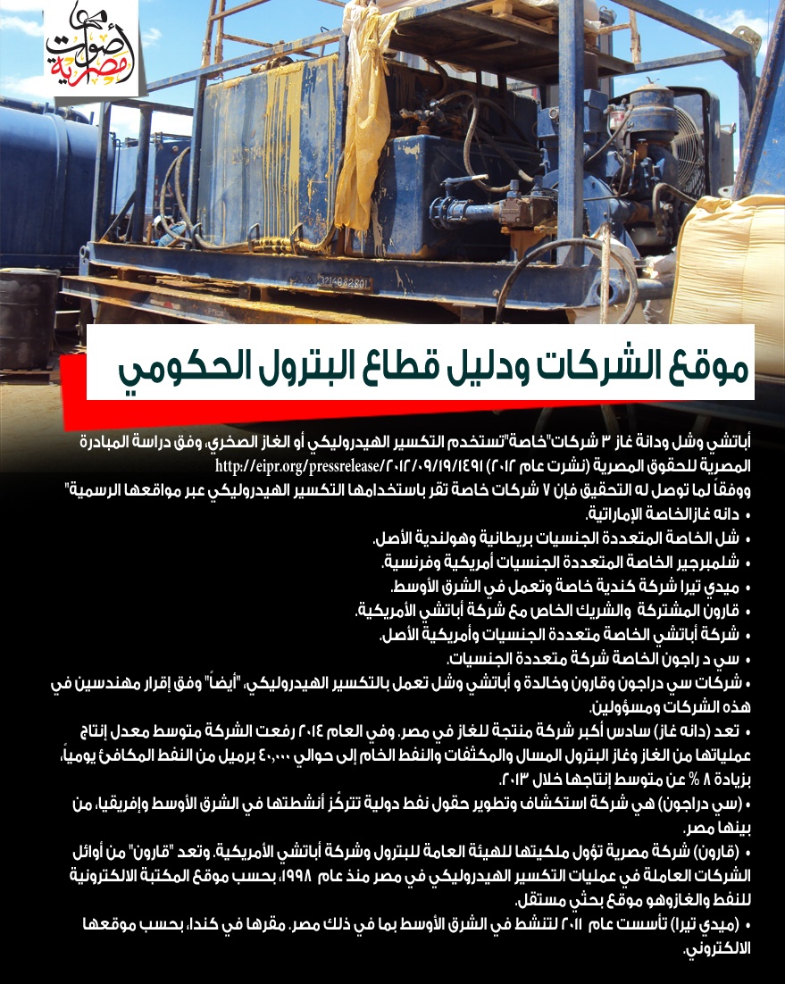 باحثة العدالة البيئية في المبادرة المصرية للحقوق الشخصية ريم لبيب تُعلق قائلة: "عندما بحثنا في الموضوع وجدنا أن عددا من الشركات ومنها شل، أباتشي، دانه غاز، خالدة، عجيبة، وقارون تنفذ تقنية التكسير الهيدروليكي في عدة مواقع بالصحراء الغربية".