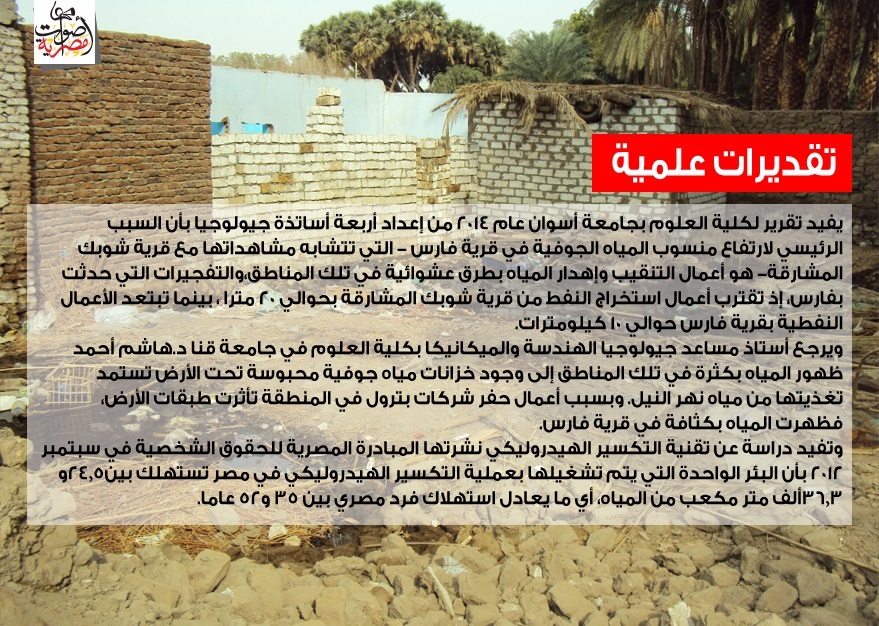 رغم الصمت الحكومي، أرجع تقرير مستقل عن جامعة أسوان(2014) والمبادرة المصرية للحقوق الشخصية (2012) الأضرار في قريتي فارس وشوبك المشارقة إلى تقنية التكسير الهيدروليكي.