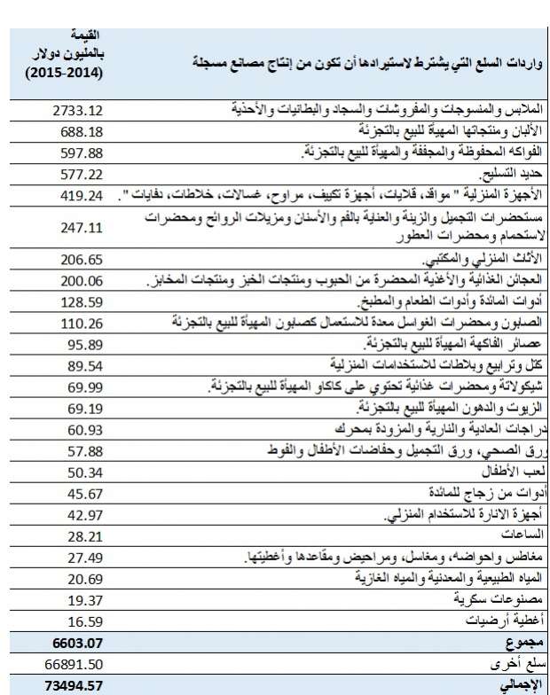 وبحسب القرار، فإنه اعتبارا من 17 مارس الحالي لن يُسمح باستيراد السلع المتضمنة في القرار إلا إذا كانت من إنتاج المصانع والشركات المسجلة.