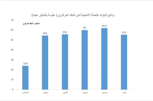 فوفقا لبيانات البنك المركزي، ارتفعت ودائع الجهاز المصرفي بالعملة الأجنبية لدى البنك المركزي بنسبة 128% بين شهري أغسطس وسبتمبر الماضيين لتتجاوز قيمتها 50 مليار جنيه، واستمرت عند هذا المستوى حتى يناير الماضي.
