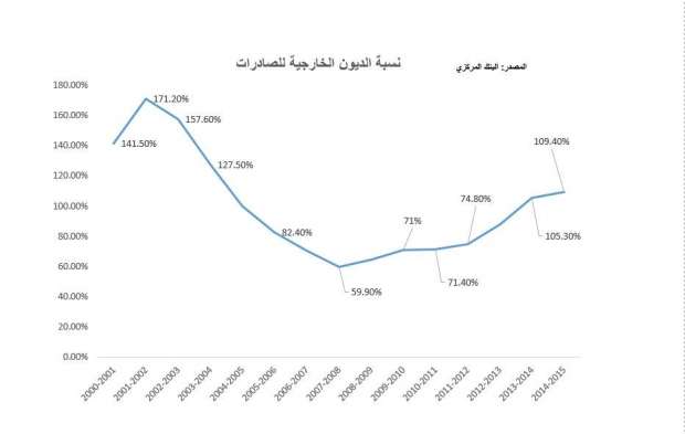 ووفقا لبيانات البنك المركزي، المنشورة على موقعه الإلكتروني، تجاوزت نسبة الديون الخارجية 100% من الدخل الأجنبي المولد من الصادرات في عام 2013-2014، وذلك لأول مرة منذ ثمانية سنوات، ثم ارتفعت هذه النسبة لنحو 110% في العام المالي الماضي.